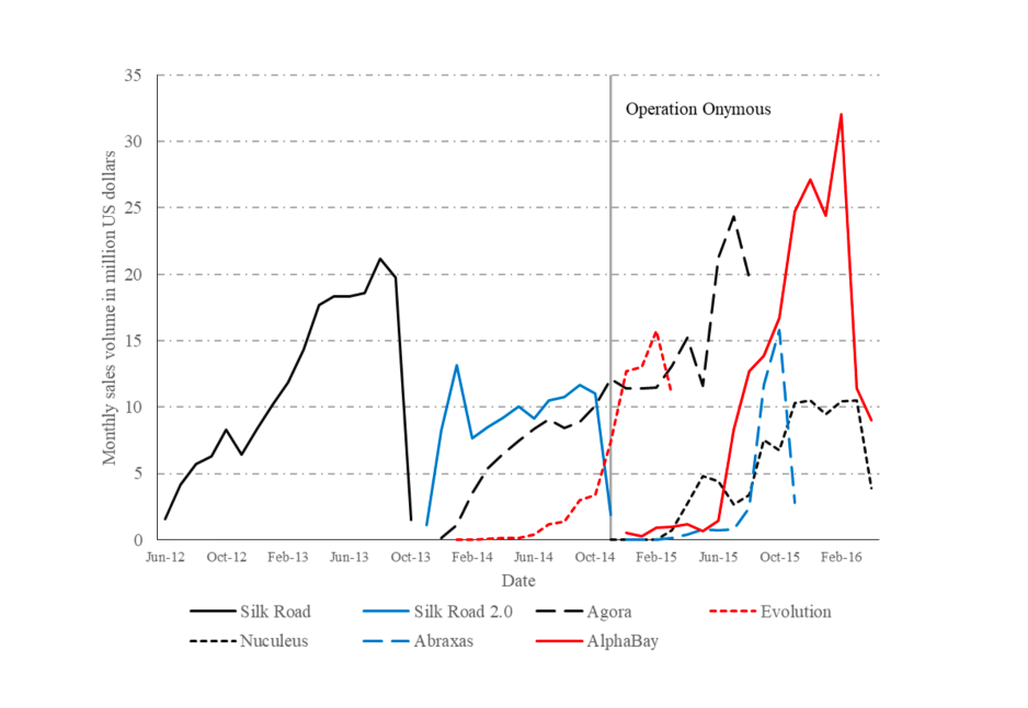 BTC transaction volumes on major Darknet markets rising and falling with shutdowns.